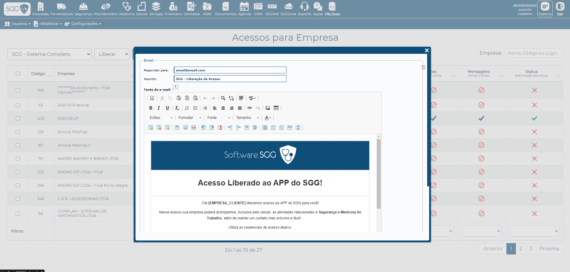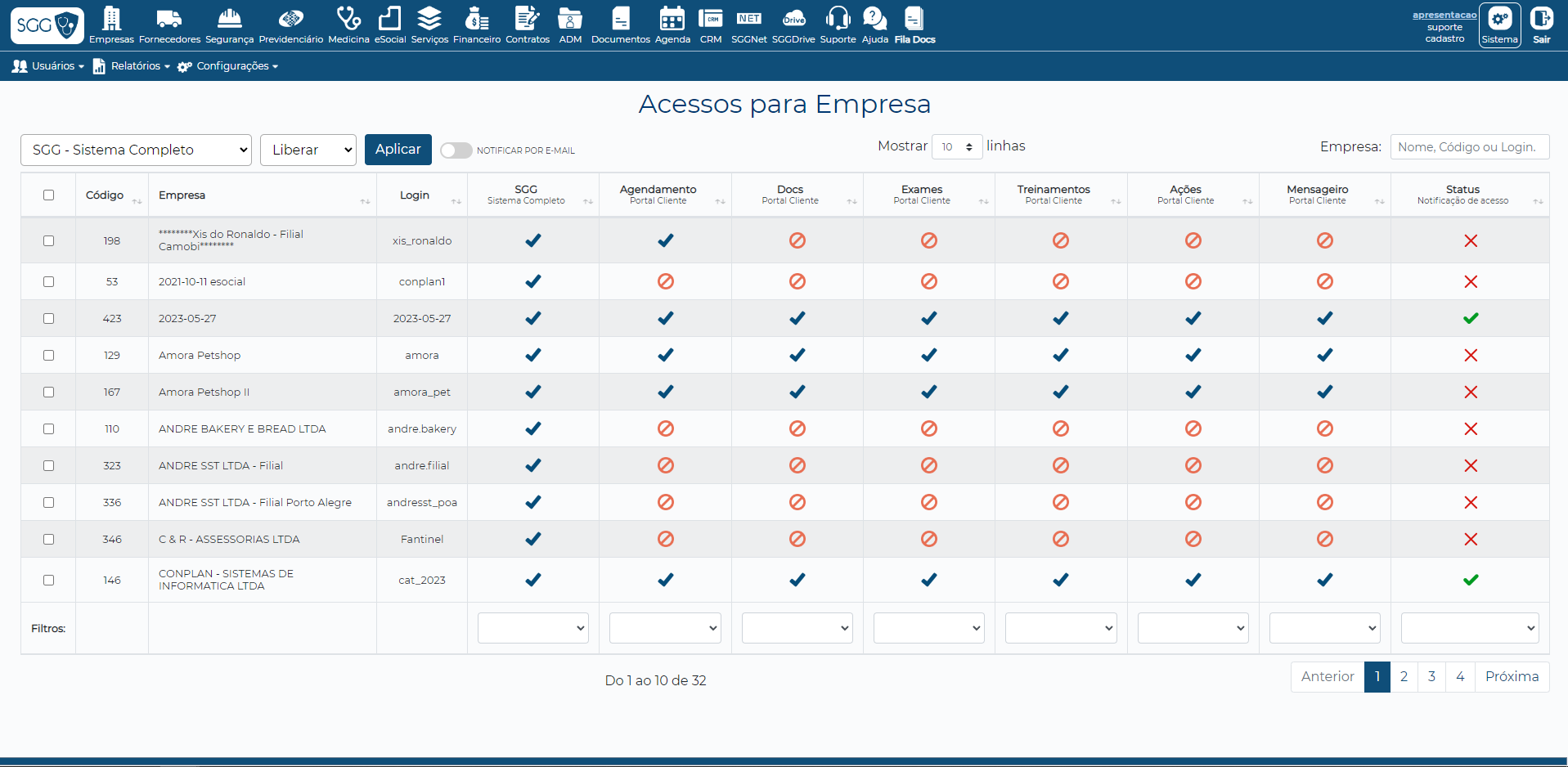 No módulo sistema é possível liberar o acesso para os clientes. Para fazer isso, clique em sistema, permissões de acesso e em seguida em acessos para empresa. Essa função acaba de ser implantada na plataforma do SGG.