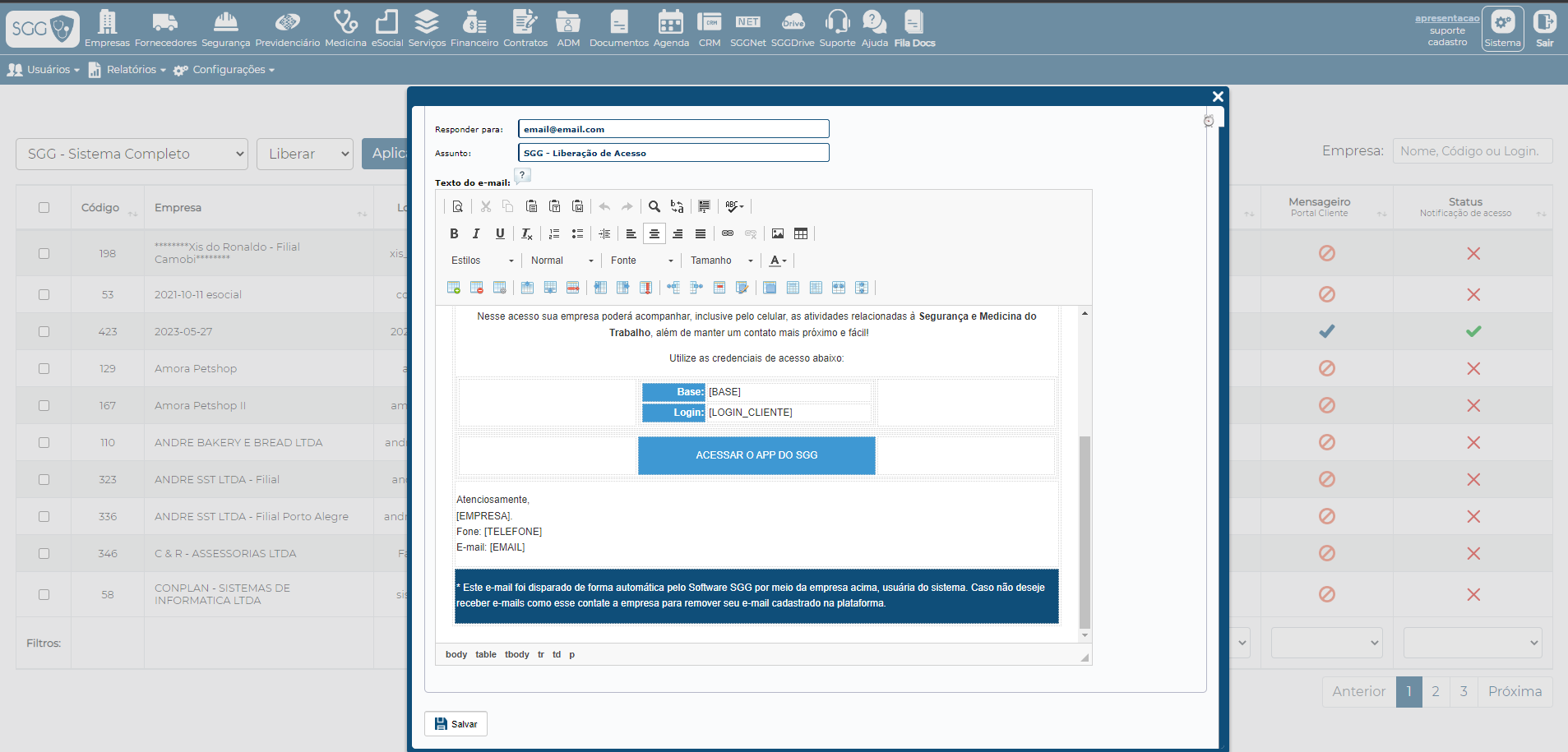 O cliente receberá um e-mail avisando que o acesso foi liberado. As informações contidas no documento podem ser editadas conforme as necessidades de cada empresa. Por exemplo, dá para acrescentar a logomarca da empresa, alterar a cor e mudar a configuração do texto. Em breve, o SGG lançará um aplicativo para android e iOS, assim o cliente poderá acessar todas as funcionalidades pelo celular.