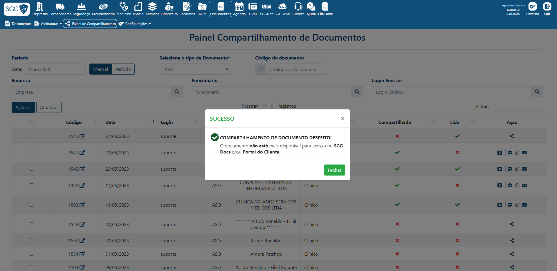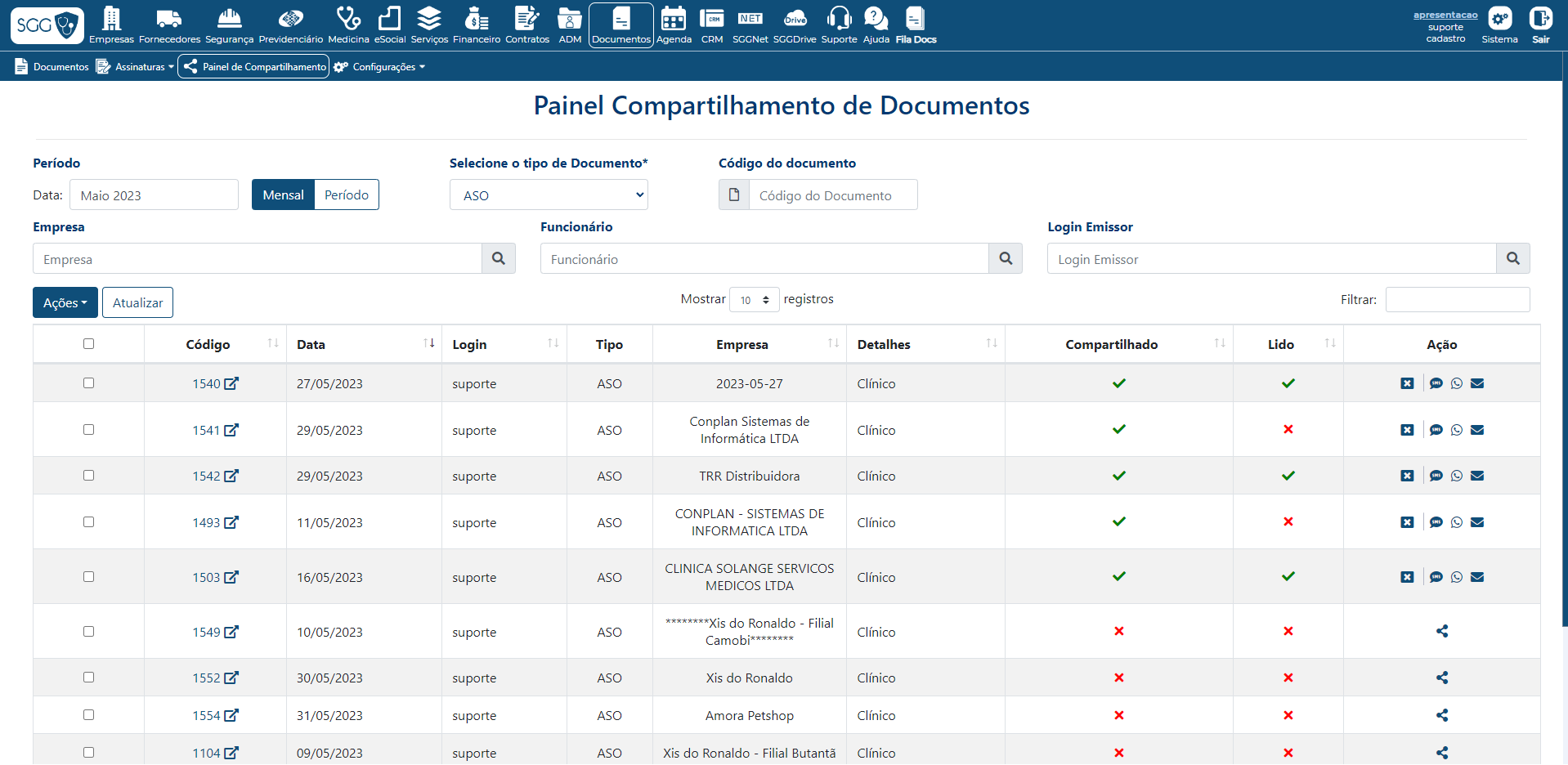 Para compartilhar os documentos com o cliente acesse o módulo documentos e a aba Painel de Compartilhamento. Selecione um tipo de documento que será compartilhado, como o ASO.