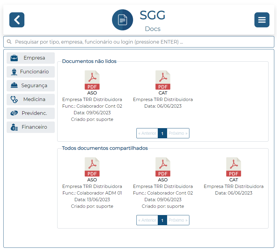 Ao acessar os documentos, no SGG Docs é possível visualizar todos os arquivos compartilhados divididos por tipo de cadastro, empresa, funcionário ou setor. No financeiro, por exemplo, estarão documentos como fatura, nota fiscal, boleto e fatura. Já no setor previdenciário se encontram os arquivos de PPP e CAT. É possível filtrar por empresa, por funcionário e por login.