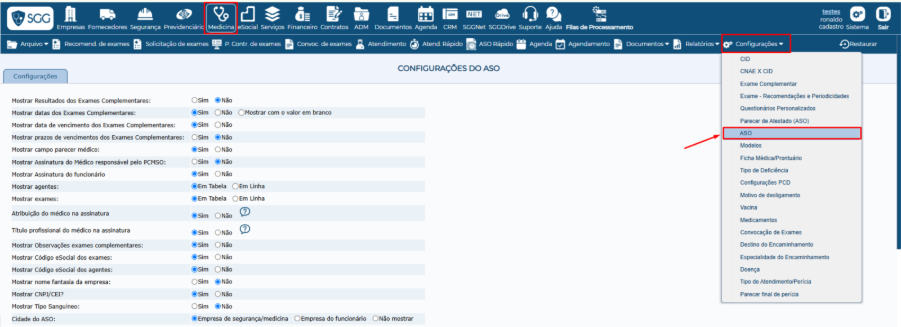Antes de emitir o ASO, acesse Medicina >> Configurações >> ASO para personalizar o modelo do documento e as configurações de sua preferência.
