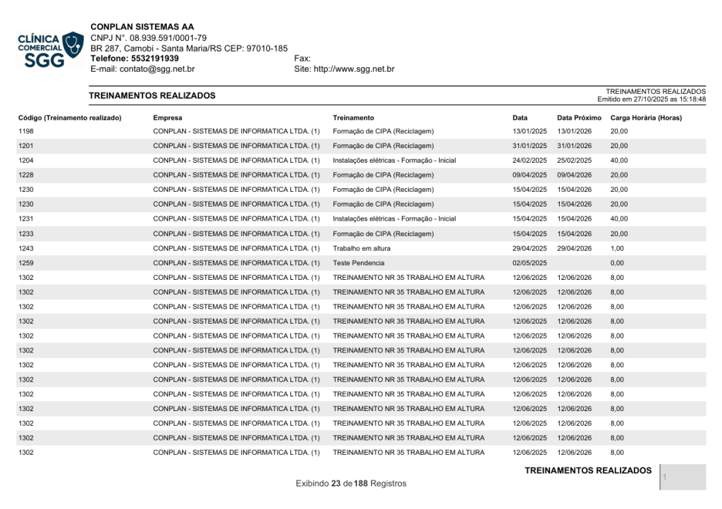 Verifique se todos os treinamentos obrigatórios foram registrados (NR-1, NR-5, NR-6, NR-35, entre outros), e se os certificados foram emitidos. No SGG, é possível gerar relatórios consolidados de treinamentos realizados, vencidos e a vencer, facilitando o planejamento do próximo ano.