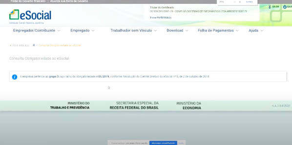 Lembre-se: nosso objetivo é consultar a qual grupo sua empresa faz parte. Por isso, clique na aba que está no canto esquerdo superior da tela denominada “Empregador/Contribuinte” e então, clique em “Consulta obrigatoriedade”. Após, você terá acesso não só à informação sobre qual grupo sua empresa compõe, mas também, a data de obrigatoriedade exigida.
