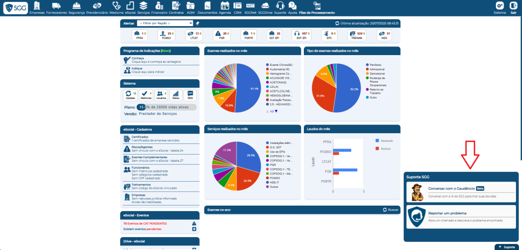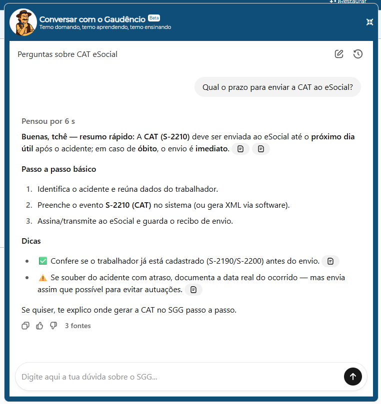 Integrado diretamente ao sistema, o Gaudêncio atua como um suporte virtual inteligente, capaz de responder perguntas sobre Segurança e Saúde do Trabalho (SST), funcionalidades do SGG e dúvidas frequentes de clientes, tudo em tempo real e sem precisar abrir um chamado.