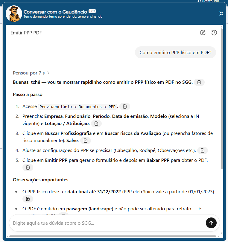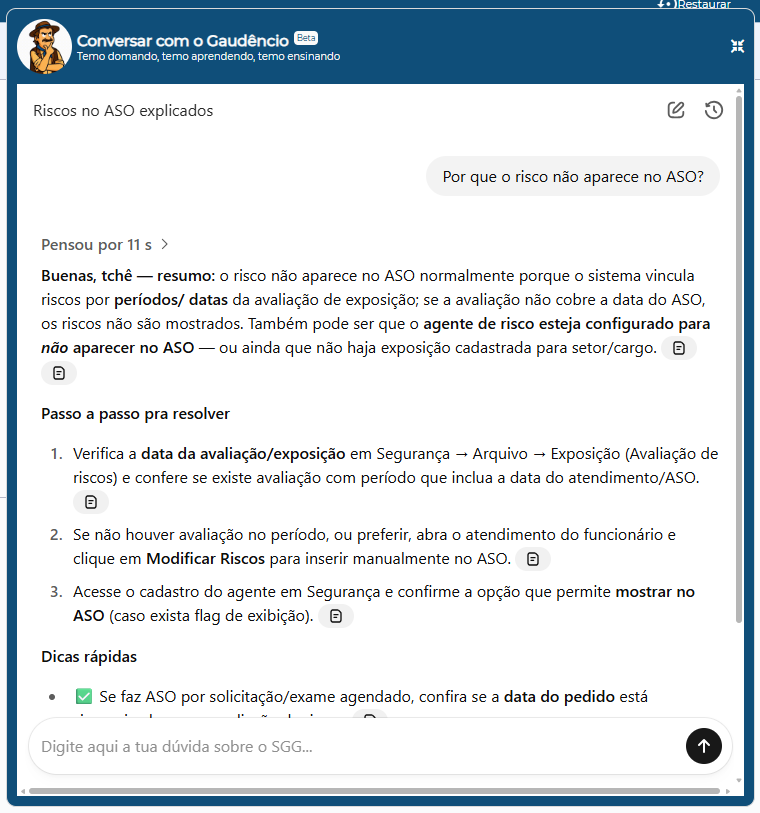 Ele vai além de um chatbot: atua como um agente de suporte baseado em IA generativa, treinado com manuais e blogs do SGG, vídeos tutoriais, FAQs oficiais e toda a documentação técnica atualizada do sistema e das normas regulamentadoras.