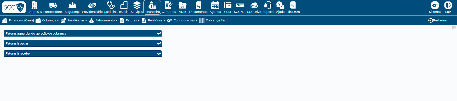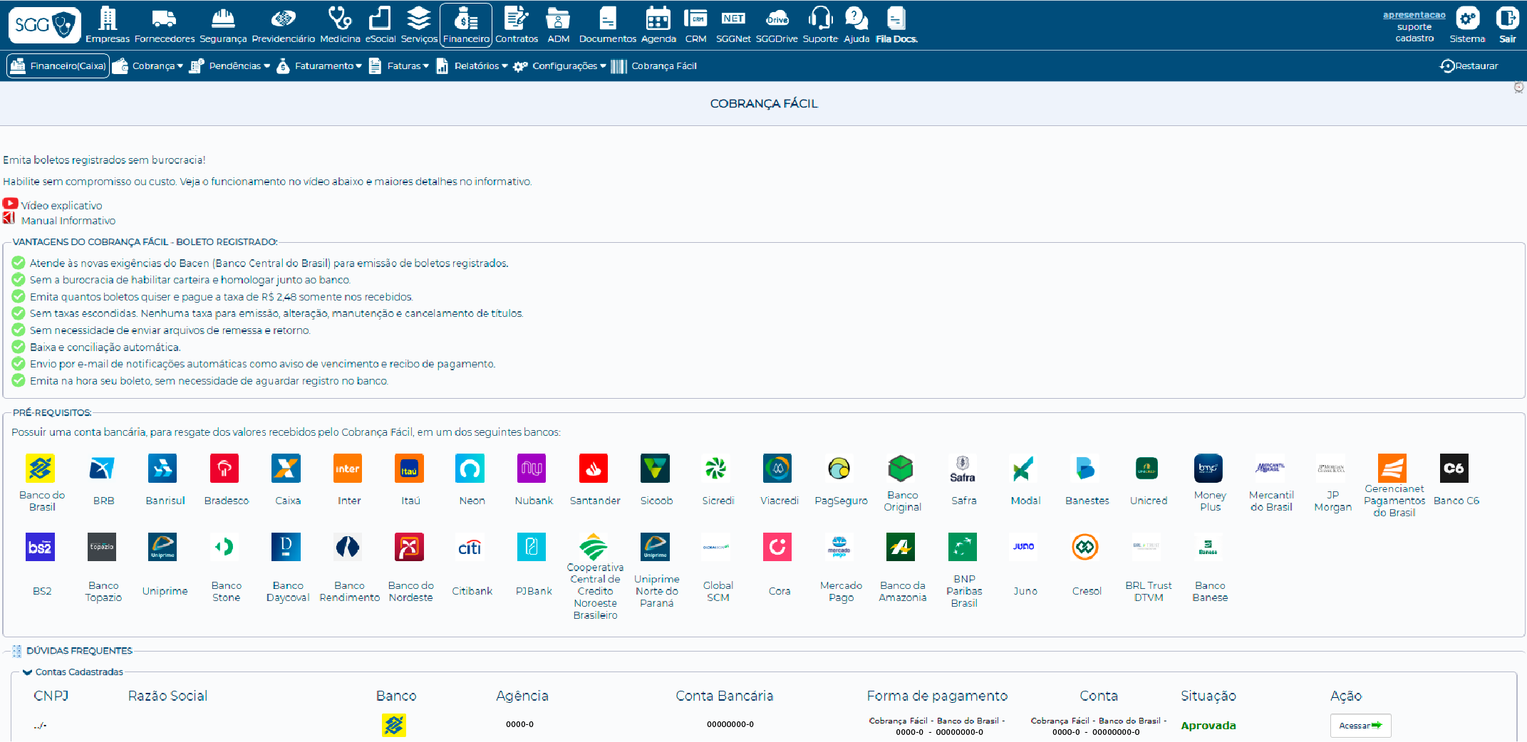 O SGG oferece o Cobrança Fácil para a clínica de SST poder emitir cobranças bancárias de forma imediata, bastando informar o banco que deseja receber os valores recebidos. Nesse recurso, o sistema emite boletos registrados, que somente terá custo se for efetivamente liquidado (pago), ou seja, a sua empresa não paga nada para cancelamento, alteração ou manutenção de boletos.