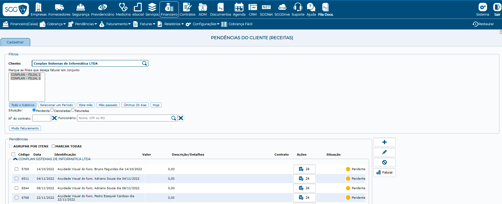Todos os exames, treinamentos e outros serviços prestados vão gerar pendências para serem cobradas do cliente, evitando você esquecer ou deixar de cobrar. Todos os valores desses serviços realizados por sua empresa no cliente, já virão com os valores definidos no contrato (acordo entre as partes), evitando possíveis erros ou divergências em faturas.