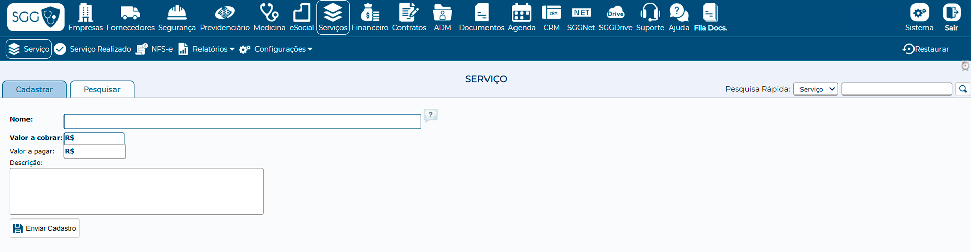 O primeiro passo para que tudo funcione bem é definir os valores dos serviços e dos exames prestados, cadastrando contratos para os clientes e fornecedores. Caso a empresa não inclua o valor no contrato e tenha um serviço realizado não terá problemas, pois o faturamento virá com valor padrão definido para aquele serviço. Se o valor cobrado para determinada empresa for diferente, basta alterar o valor no campo correspondente no momento do faturamento. Dessa forma, o sistema se adapta facilmente a sua rotina e permite ajustes fáceis antes de faturar determinado cliente.
