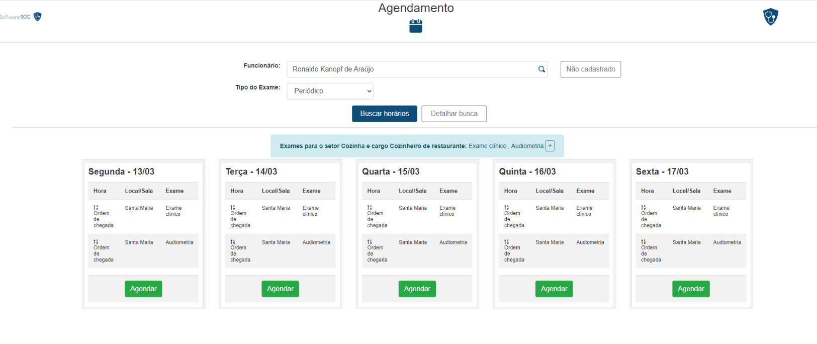 Após o agendamento o sistema gera uma guia com os exames que serão realizados. Essas informações serão vinculadas a agenda da clínica. Dá para criar mais de uma agenda de atendimento, ou seja, uma para cada sala ou para procedimento da clínica de SST.