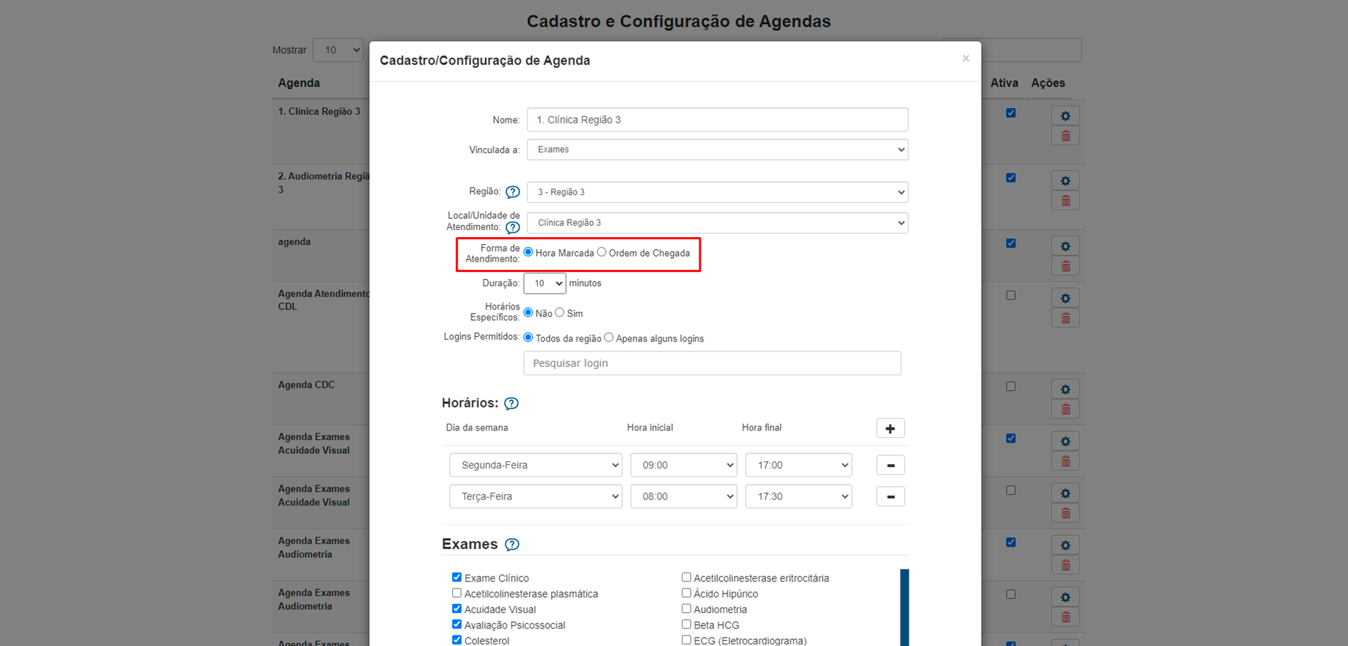 Clique em configurações e em agenda médica. Determine um nome para a agenda, como por exemplo: sala 1, sala 2 e sala 3. Estabeleça o tempo padrão de atendimento para os exames (por exemplo: 10 minutos, 15 minutos, 30 minutos). Você poderá também definir os dias específicos da semana em que ocorrem atendimentos na clínica. Essa parametrização poderá ser a mesma para todas as agendas da clínica ou específica de um determinado setor. Por exemplo para o atendimento do Psicólogo, que em geral possui duração maior do que um exame clínico realizado pelo Médico Examinador.