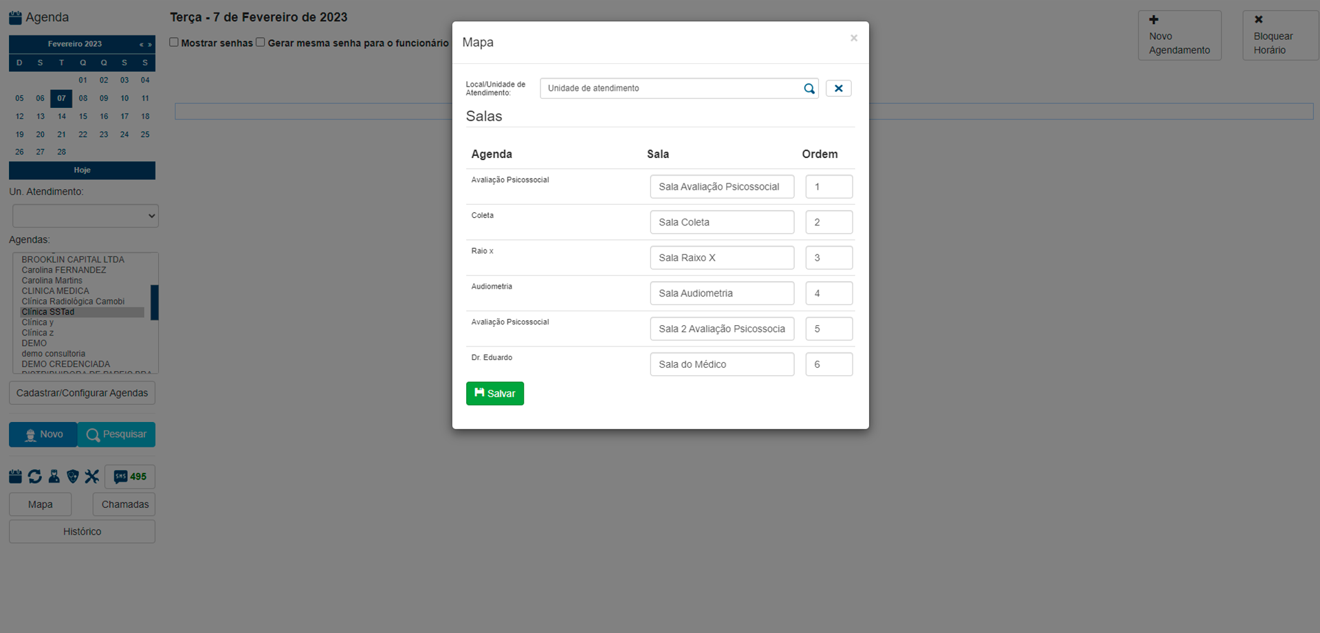 Para editar o mapa da clínica, definido por agendas/salas de atendimento, selecione a unidade e configure a sequência de exames ou procedimentos que serão realizados. Também é preciso determinar a sala e o horário dos atendimentos.