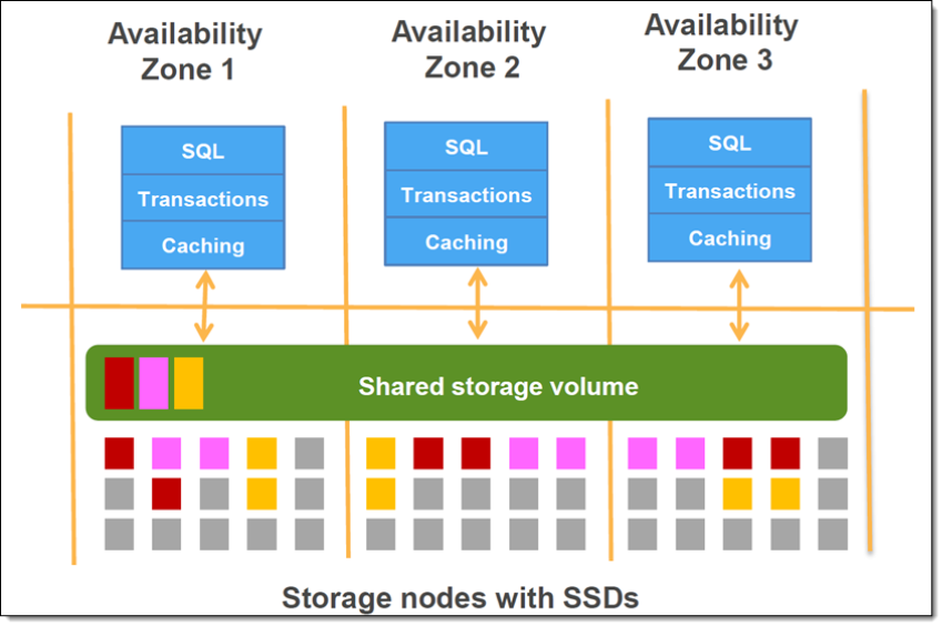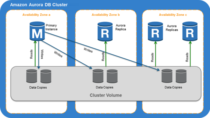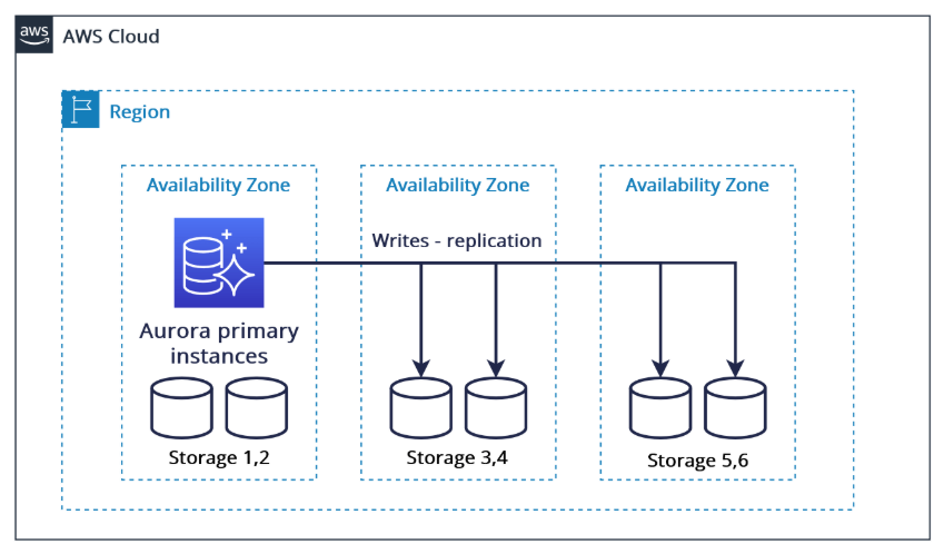 No Aurora, os dados não ficam armazenados em um único servidor. O armazenamento é automaticamente replicado em seis cópias distribuídas por três zonas de disponibilidade distintas dentro da mesma região AWS.