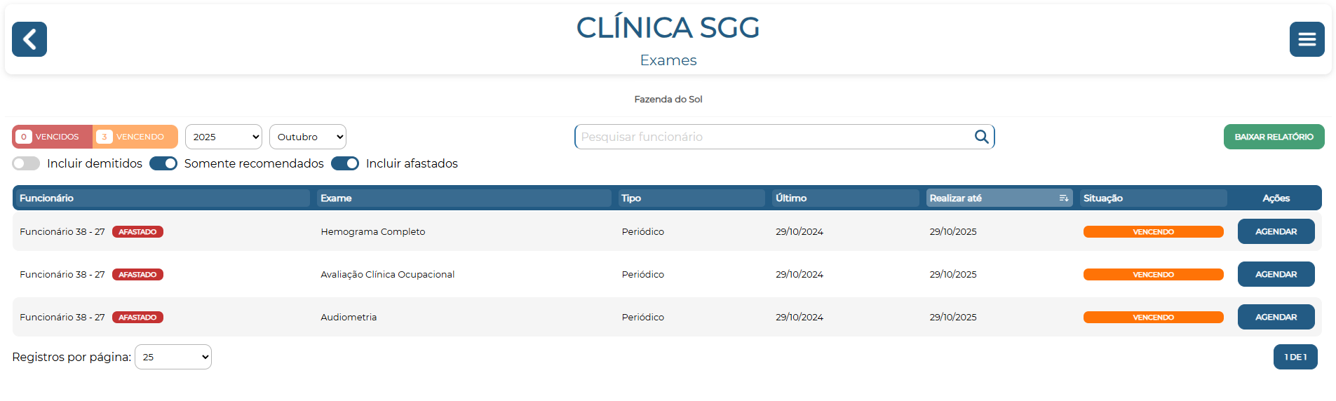 Lista os exames admissionais, periódicos, de retorno ao trabalho, de mudança de função e demissionais realizados pelos funcionários da empresa.