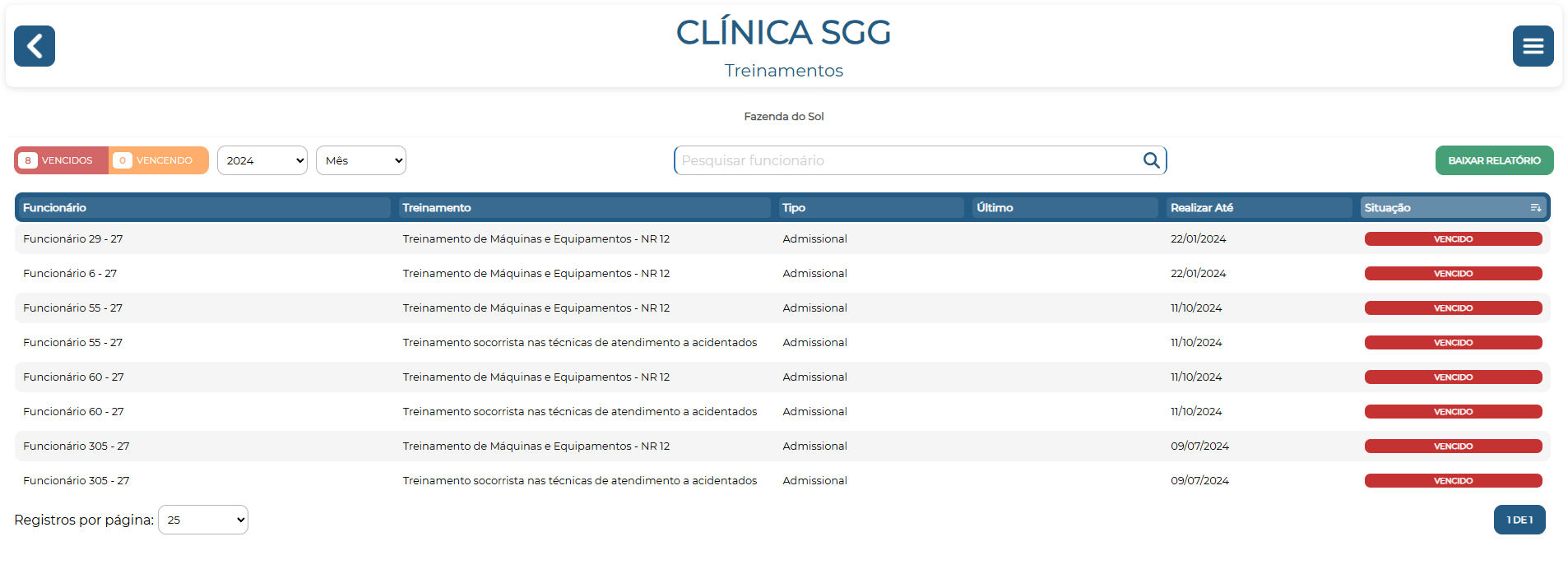 Exibe treinamentos realizados ou com vencimento próximo, facilitando o acompanhamento do cronograma legal exigido pelas NRs.