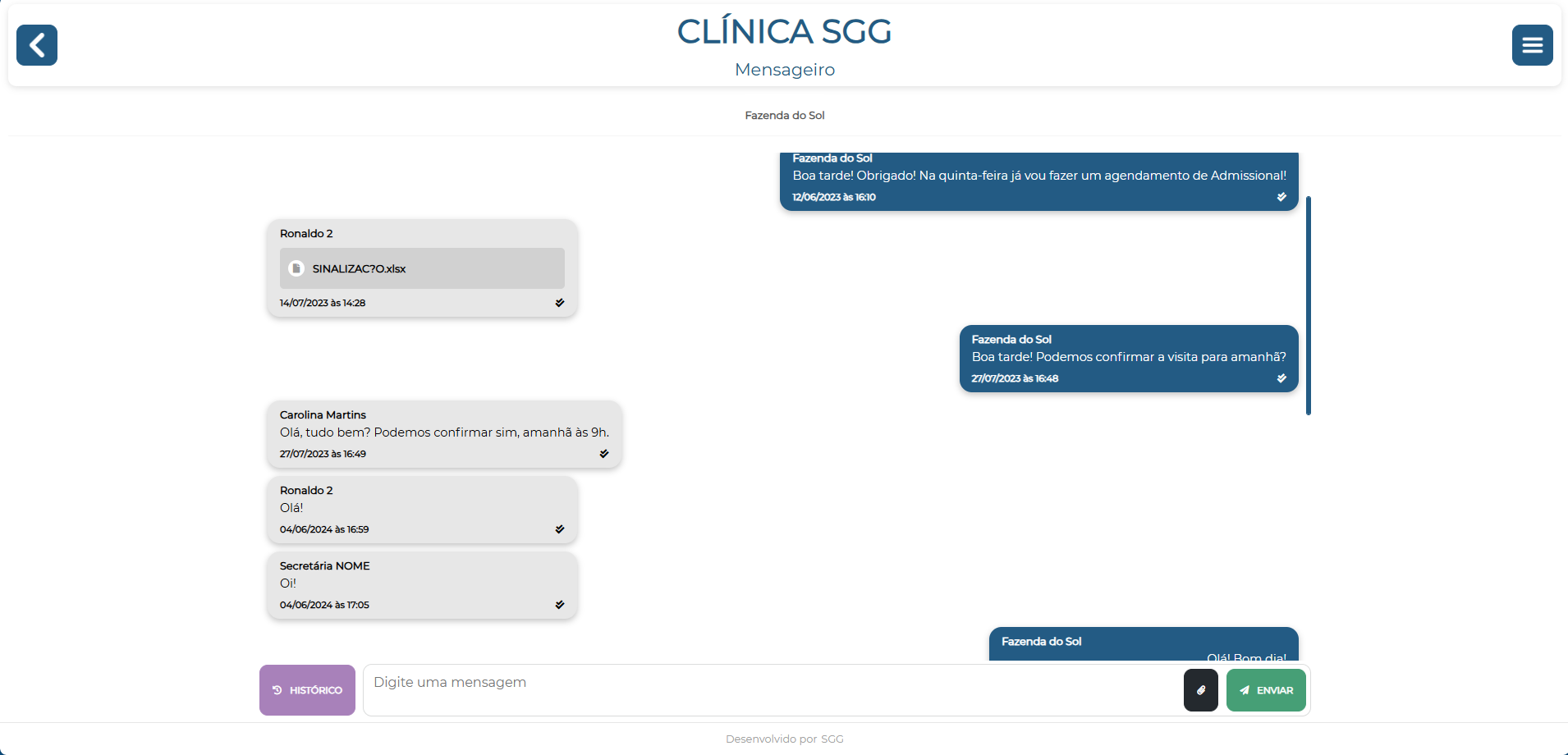 Ferramenta interna de comunicação direta entre cliente e clínica, evitando trocas dispersas por e-mail e telefone e centralizando o histórico de conversas.