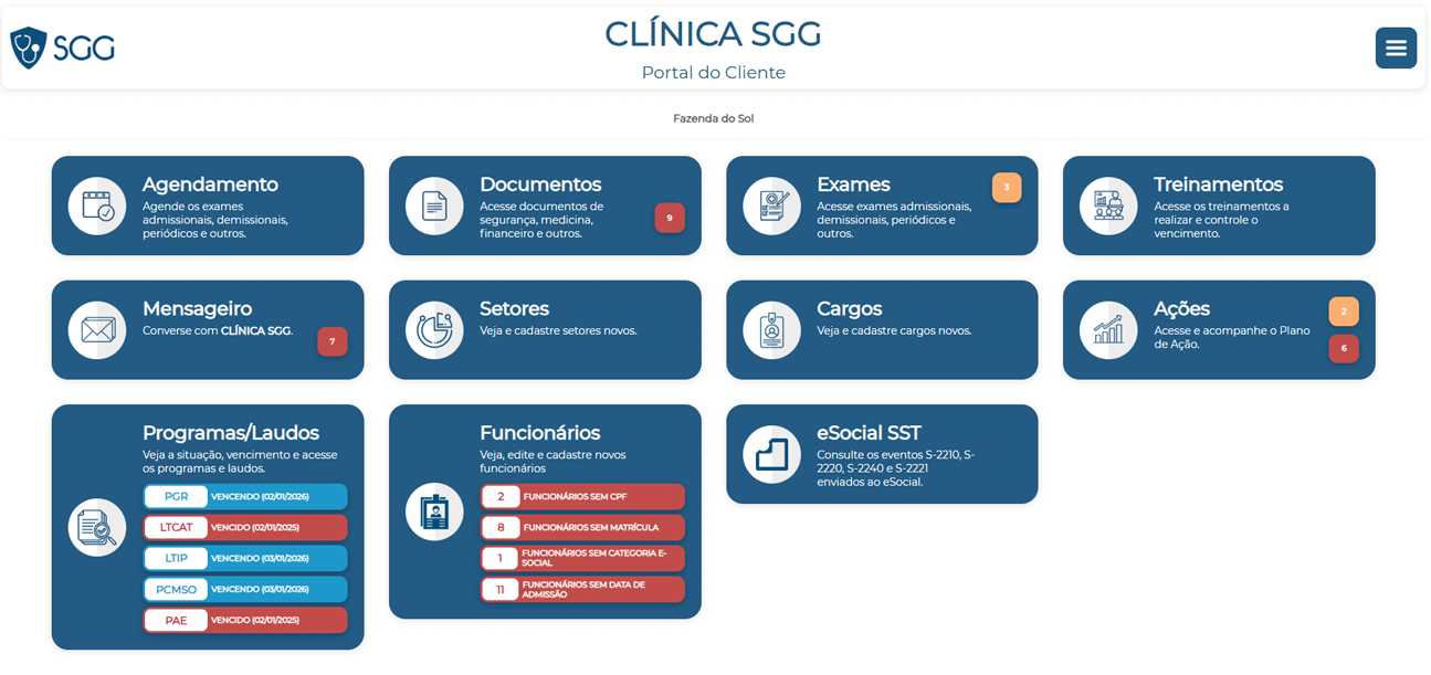 Trata-se de um ambiente personalizado que centraliza agendamentos, documentos, treinamentos, laudos, programas, exames, ações e, mais recentemente, os eventos do eSocial SST, setores e cargos, garantindo que cada cliente tenha autonomia para acompanhar suas próprias obrigações legais e gerenciais.